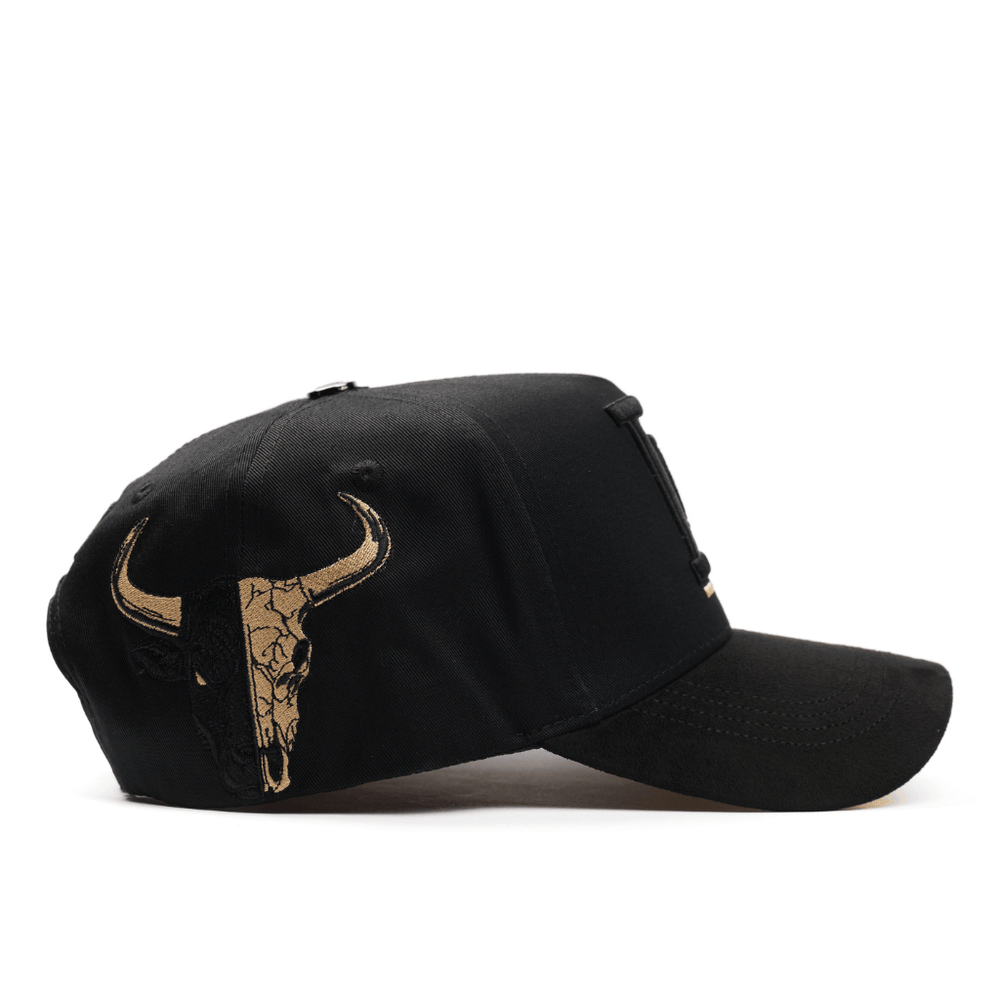 Del lado opuesto, el bordado de una cabeza de toro refuerza su esencia ranchera y auténtica. La visera curva con acabado en contraste y el interior personalizado elevan la experiencia, convirtiéndola en una gorra ideal para quienes buscan estilo, tradición y actitud.