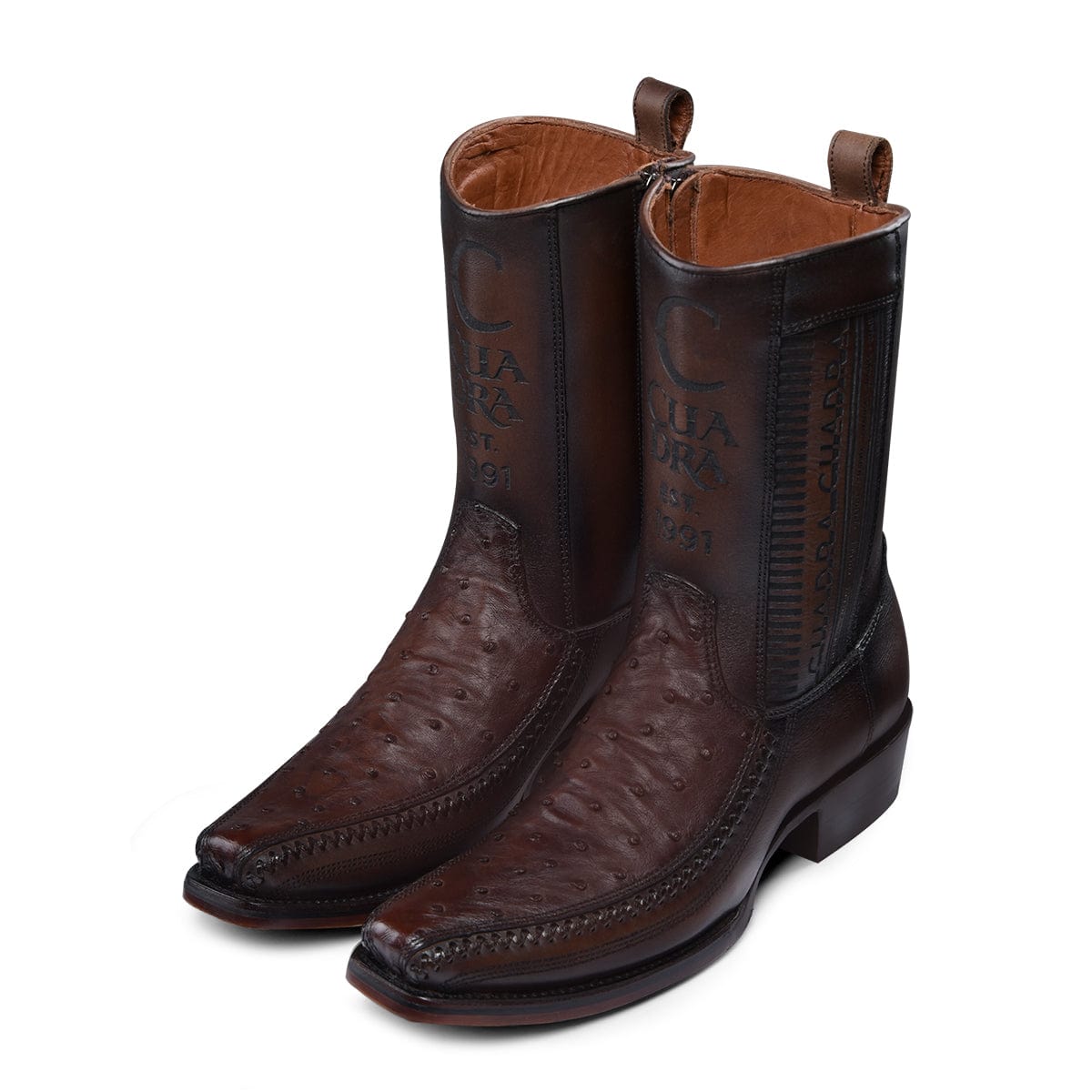 Estas botas vaqueras para hombre de la marca Cuadra son el epítome de la elegancia y la exclusividad. Confeccionadas con piel de bovino y avestruz en tono café, sombreadas a mano con un diseño grabado a láser en el tubo. Además, cuentan con cierre lateral interno para una inserción más cómoda.