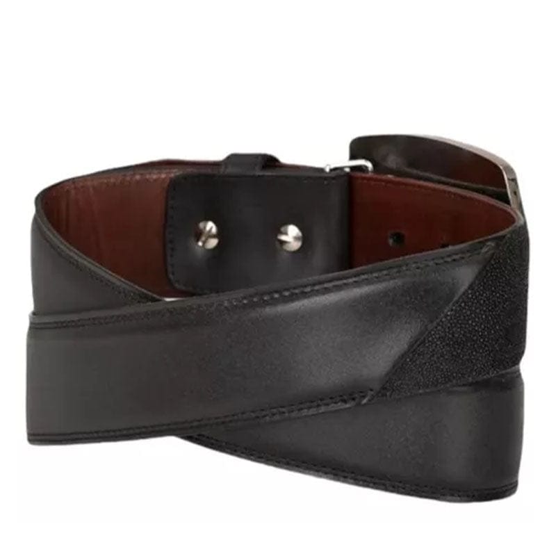 Confeccionado en piel auténtica de mantarraya, este cinturón destaca por su textura única y brillante, que aporta un toque sofisticado a cualquier atuendo. Su elegante tono negro lo hace versátil y fácil de combinar, ideal para quienes buscan un accesorio distintivo y refinado.