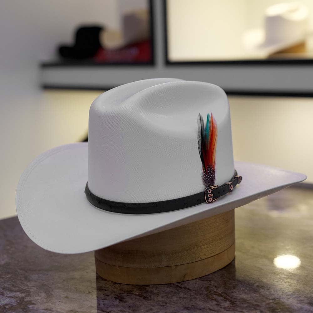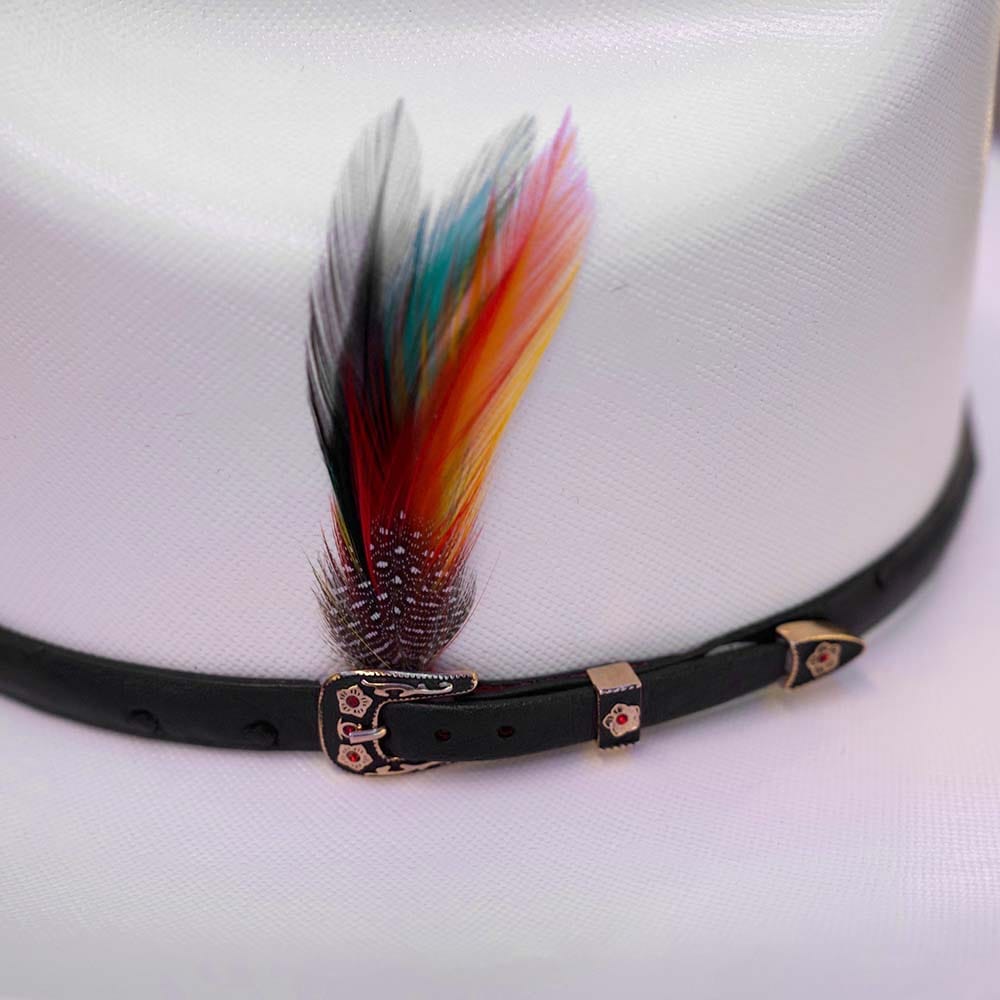 Este sombrero es una obra maestra de elegancia y lujo, confeccionado con la máxima precisión y atención al detalle. Fabricado con la prestigiosa calidad 10,000X, es un símbolo de artesanía excepcional. Su toquilla de avestruz en color negro le confiere una textura suave y exquisita, mientras que la pluma de colores que adorna su banda añade un toque de vivacidad y sofisticación. Este sombrero no solo es una declaración de estilo, sino también un testimonio de tu aprecio por la excelencia y la exclusividad.