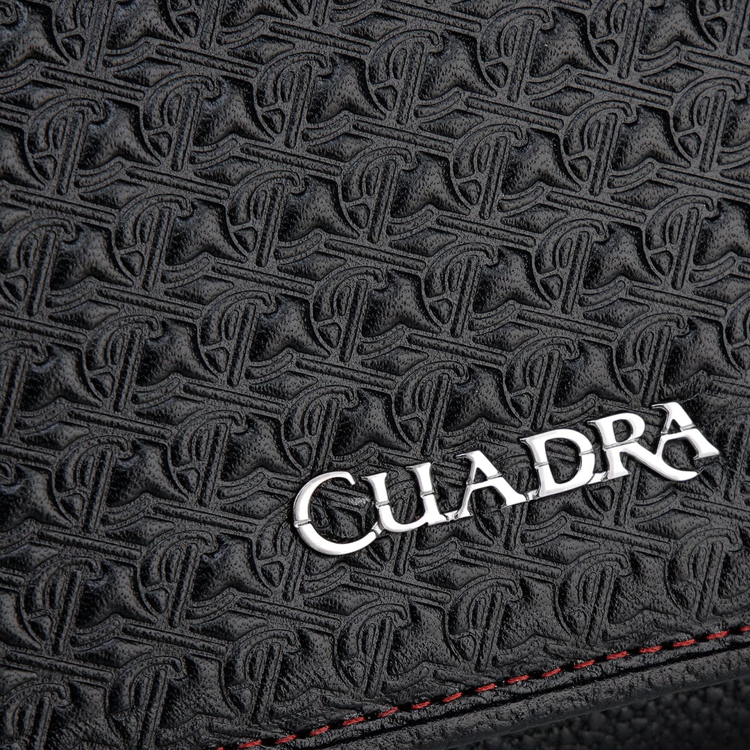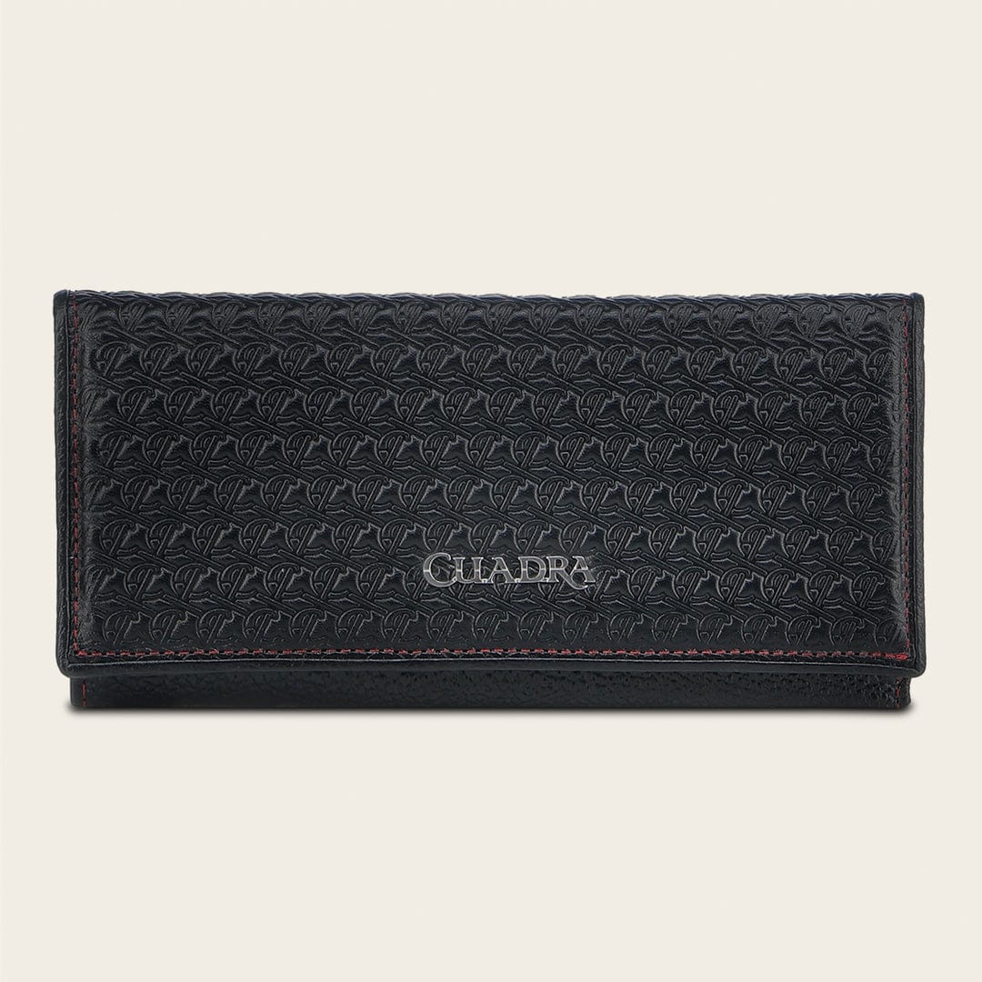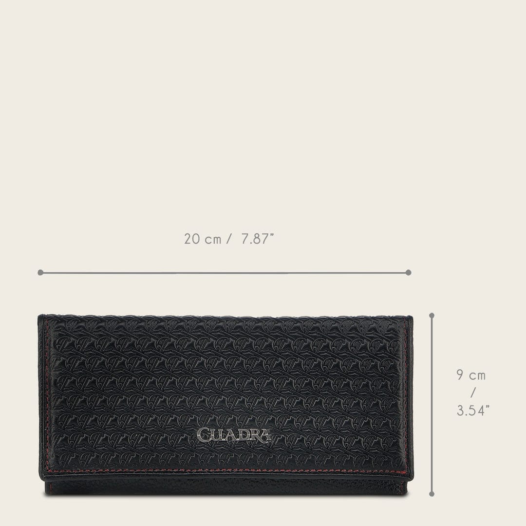 Cartera para dama en piel genuina. Presenta mini monograma de Cuadra y bordado en color contrastante. Aplicación metálica del logotipo Cuadra. Asegurada con broche. En su interior cuenta con doce tarjeteros, dos espacios para efectivo y un espacio para monedero.