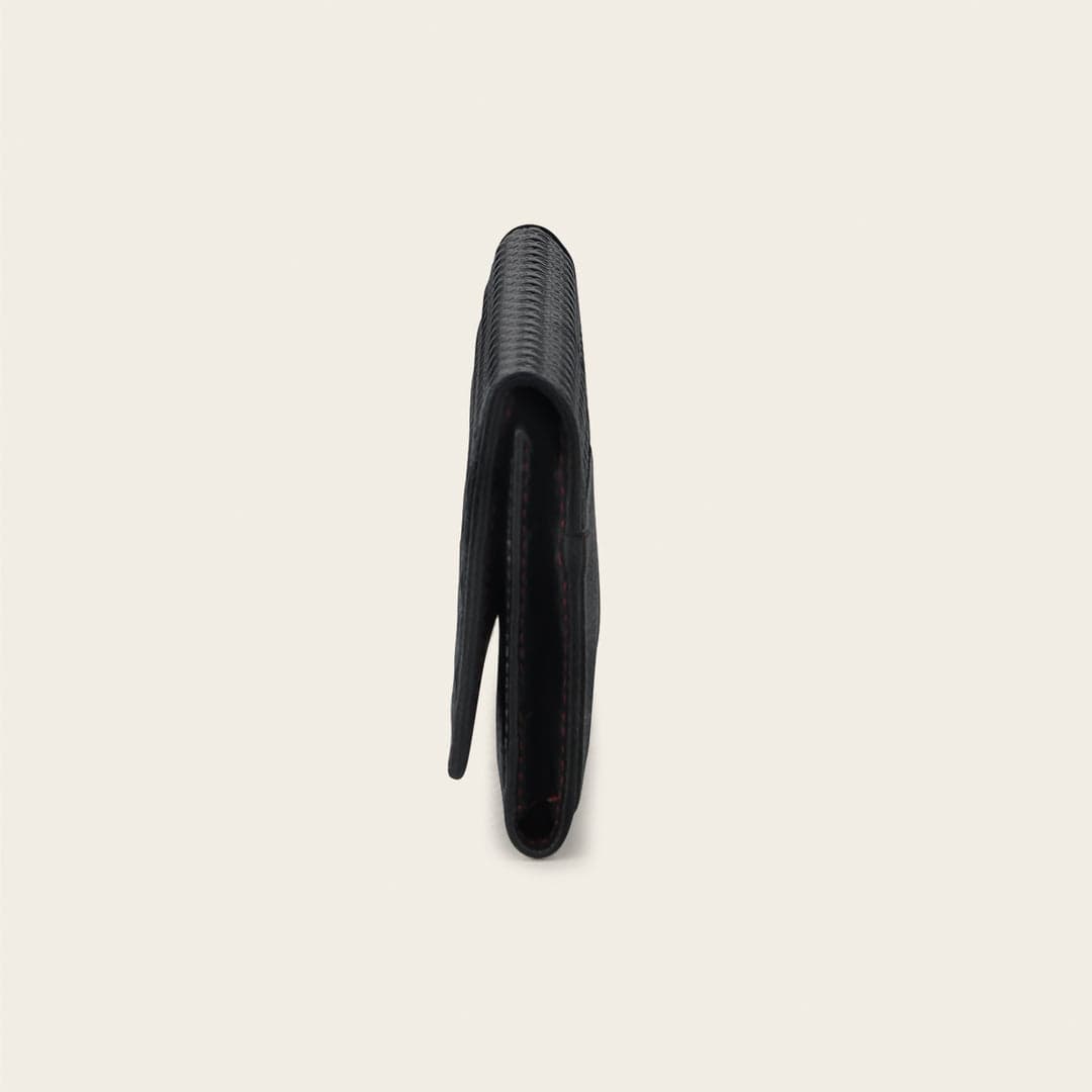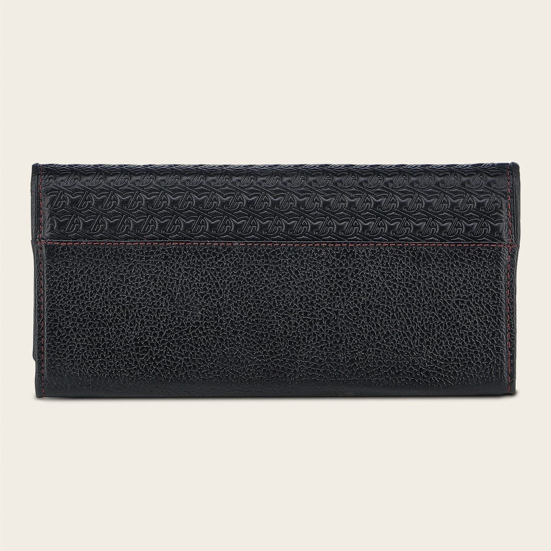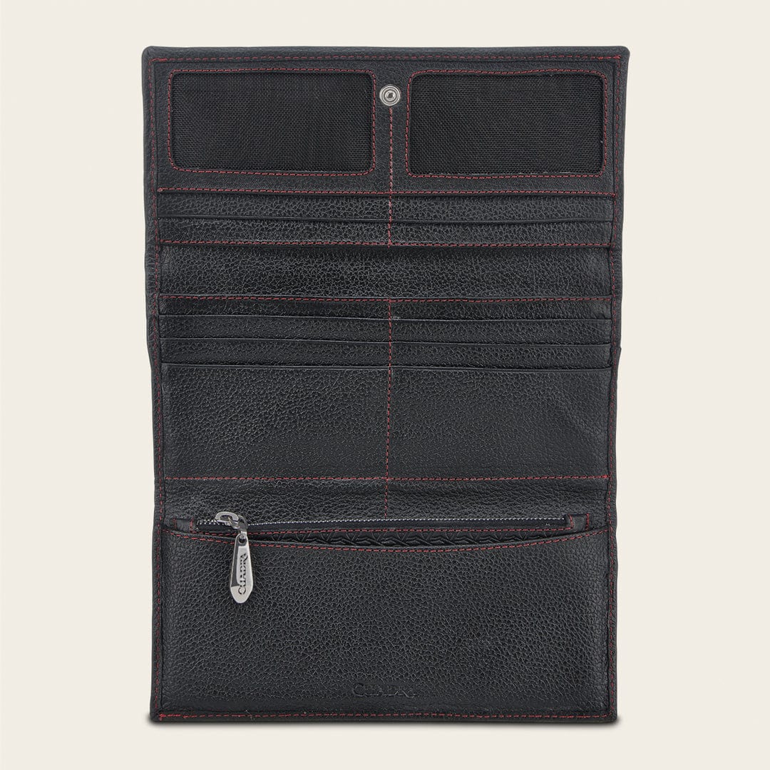 Cartera para dama en piel genuina. Presenta mini monograma de Cuadra y bordado en color contrastante. Aplicación metálica del logotipo Cuadra. Asegurada con broche. En su interior cuenta con doce tarjeteros, dos espacios para efectivo y un espacio para monedero.