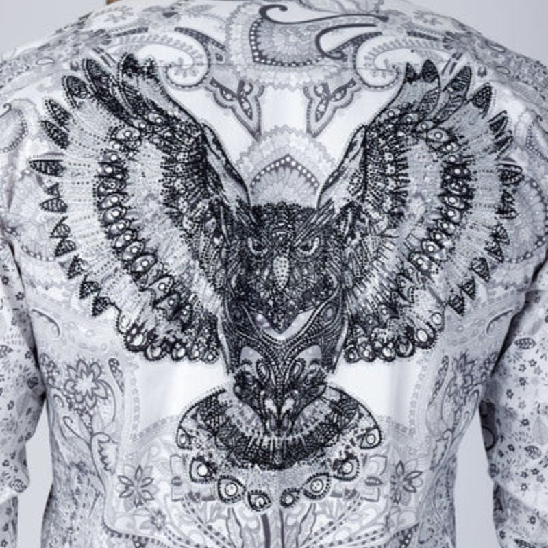 Experience luxury and unique style with the Blush wrap button-down shirt. Hand-placed rhinestones in a stunning Baroque design adorn the lightweight material, providing a slim fit with long sleeves.