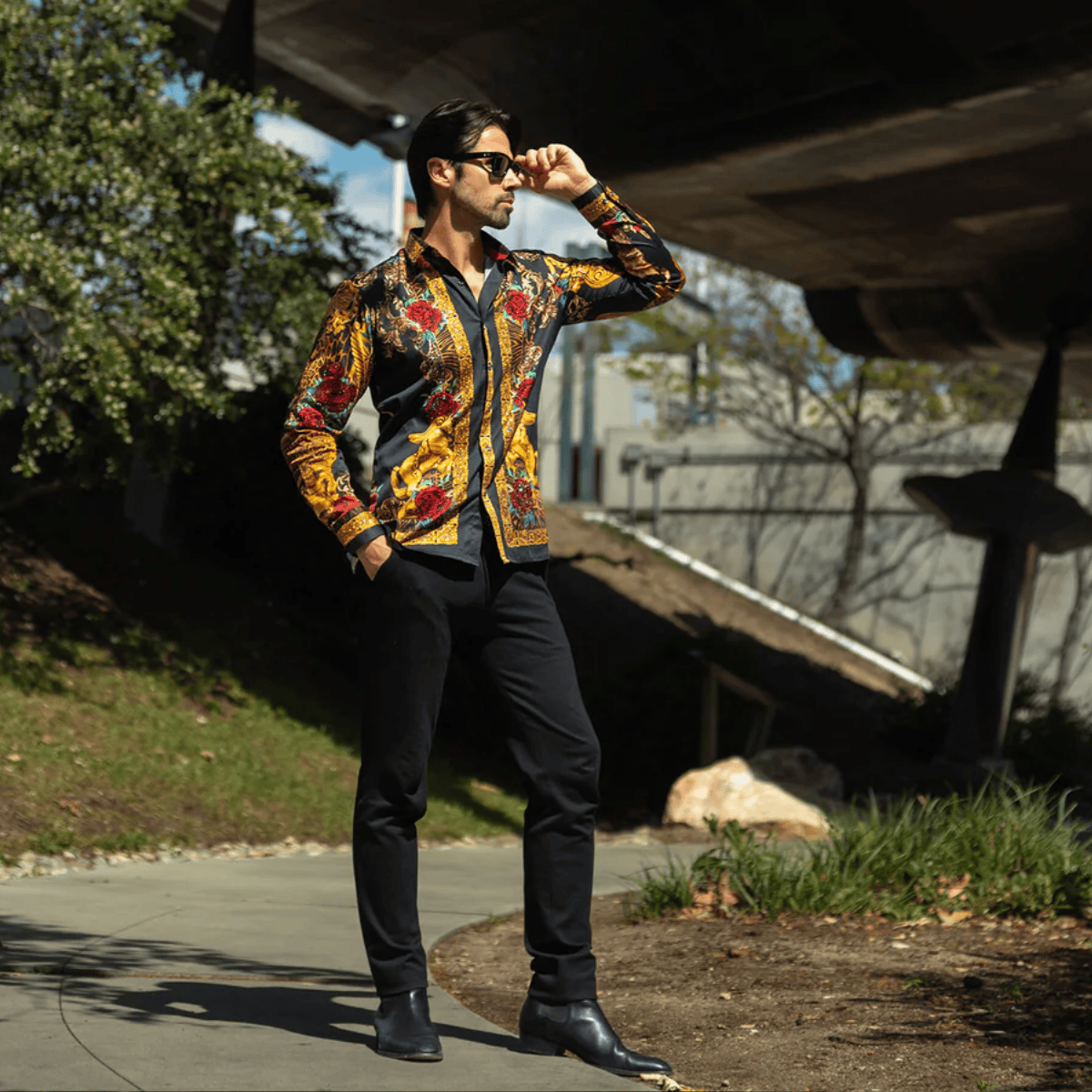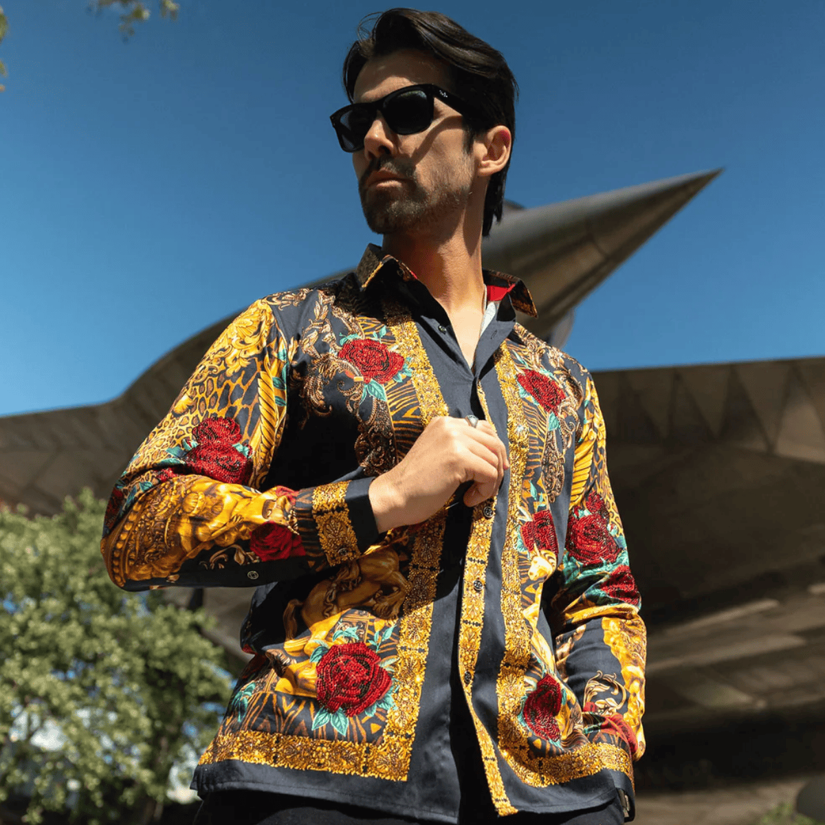 The Radiant Sculpt is a luxurious button-down shirt featuring a hand-placed rhinestone Baroque design. Its lightweight material ensures a slim fit with long-sleeves, and the floral and unicorn print design makes it a unique and stylish choice.