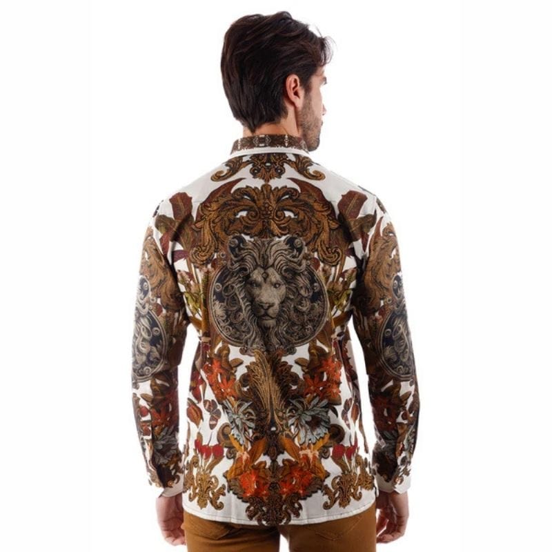 The Snazzy Genre button-down shirt showcases a stunning hand-placed rhinestone Baroque design, lending a touch of opulence. Its lightweight fabric offers a sleek fit with long sleeves, while the floral and tiger print motif adds a distinctive and fashionable touch.