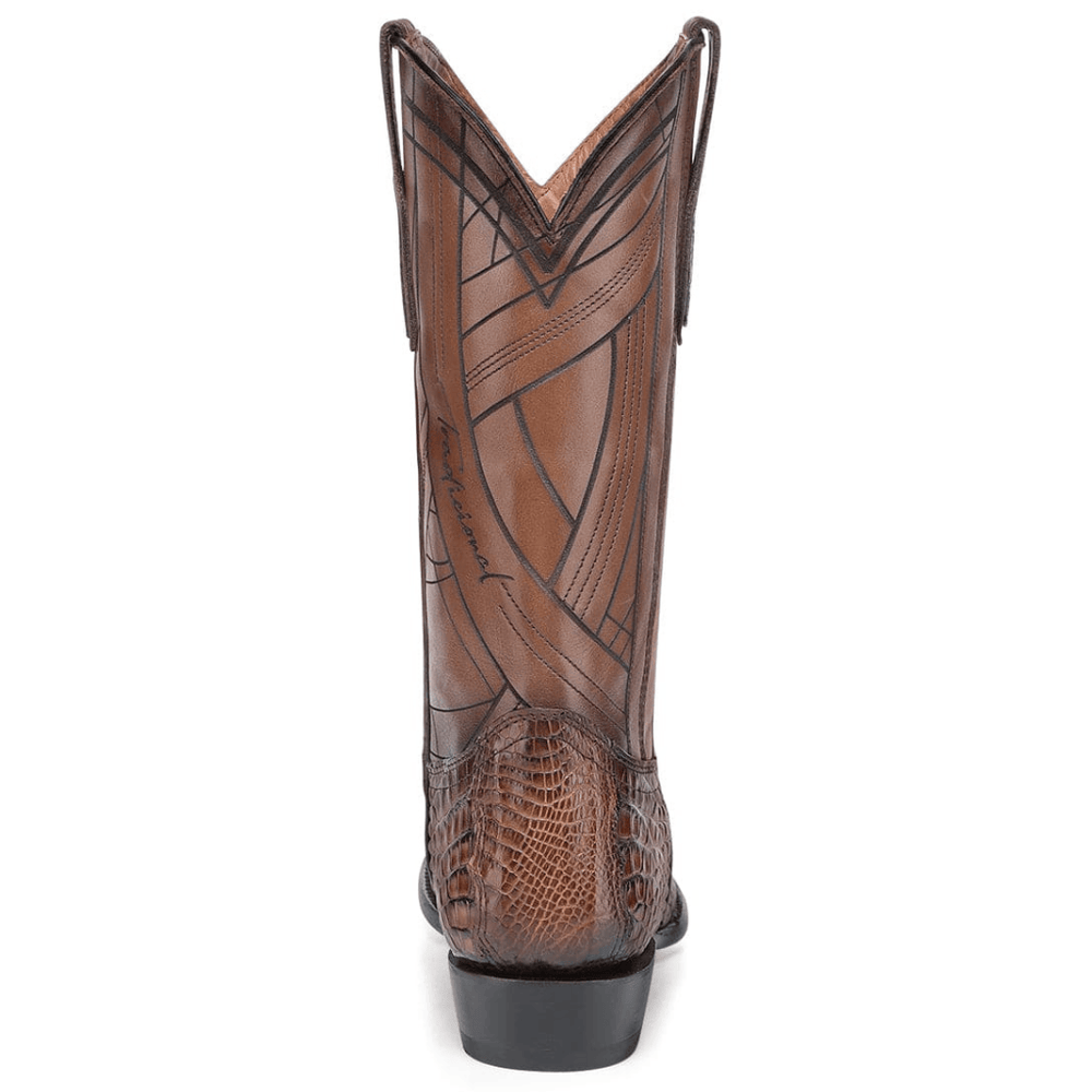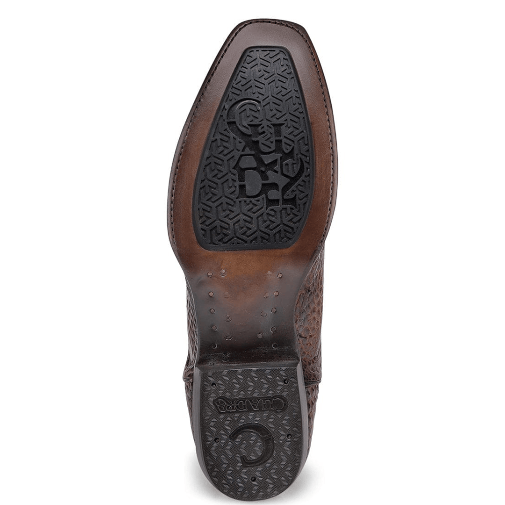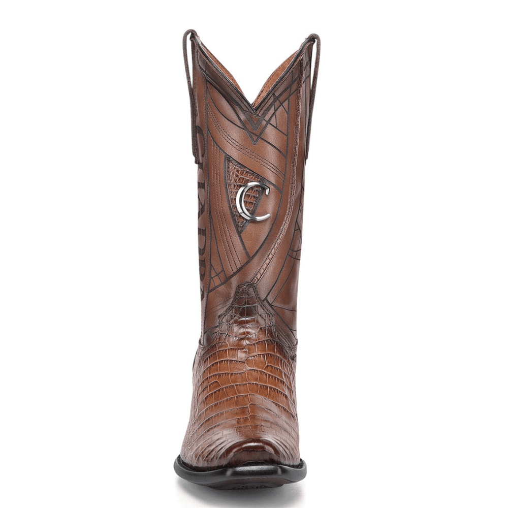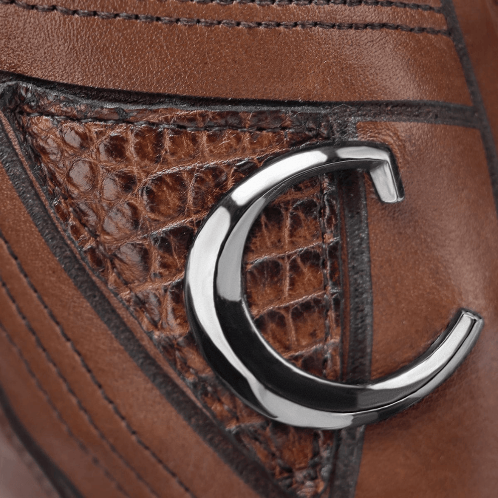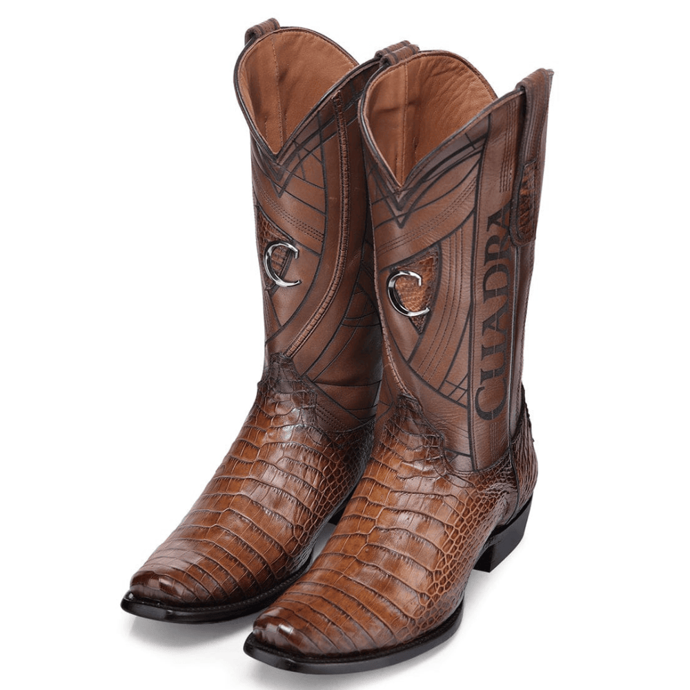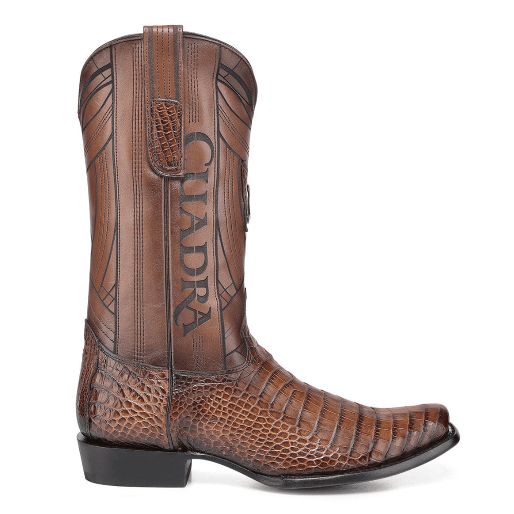 El diseño combina una piel exótica de escamas grandes con un acabado brillante que resalta cada textura natural del alligator. La parte del tubo está elaborada en piel de res con grabados artesanales y un diseño geométrico moderno donde destaca el nombre CUADRA, aportando presencia y exclusividad. Incluye un detalle metálico lateral que acentúa el carácter elegante de la bota.