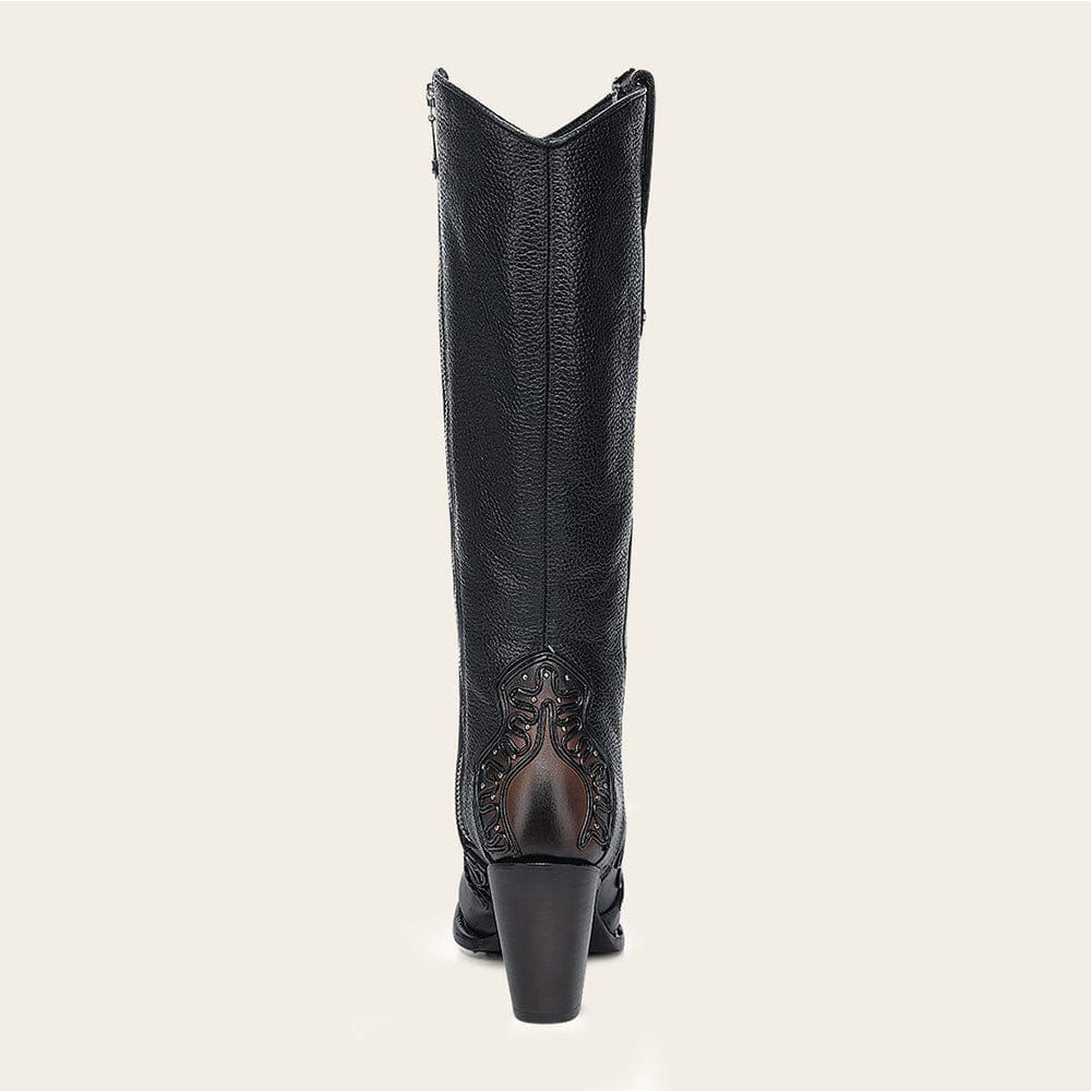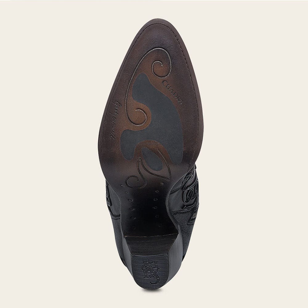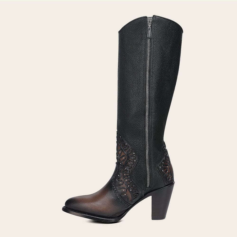 Bota alta para dama en piel genuina de bovino. Presenta bordado en alto relieve, perforado láser en motivos geométricos y aplicación de cadena metálica. Ajustada con cierre interno y aplicación textil elástica en la parte trasera. Cuenta con las nuevas tecnologías: platilla flex removible, planta Ortholite, que le dan mayor ligereza, confort, transpirabilidad y amortiguación y un tubo suave diseñado con entretelas. Con suela de cuero con injerto de TPU.