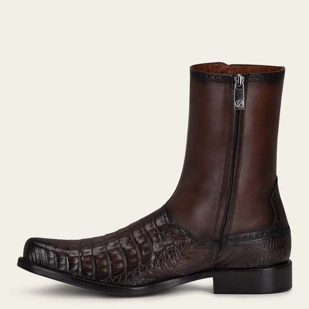 Este Botin Cuadra Cafe para hombre ofrece un calzado con estilo y de alta calidad. Está hecho con piel de caimán y ternera, con una suela de vaqueta resistente. La punta oval y el cierre lateral asegurarán un ajuste suave y seguro. Calidad garantizada de la marca Cuadra.