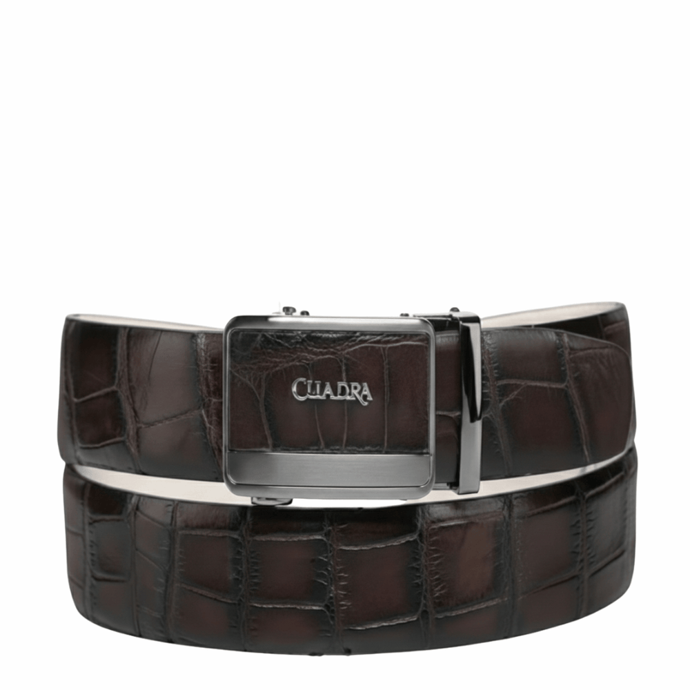 El cinto Cuadra Alligator Reserve está elaborado en auténtica piel de alligator color chocolate, una pieza que transmite poder silencioso y elegancia absoluta. Su textura natural, cuidadosamente seleccionada, se complementa con una hebilla metálica de diseño sobrio con grabado Cuadra, logrando un equilibrio perfecto entre tradición artesanal y lujo contemporáneo. Ideal para el hombre que impone estilo sin necesidad de exagerar, este cinto eleva cualquier atuendo con presencia firme y sofisticada.