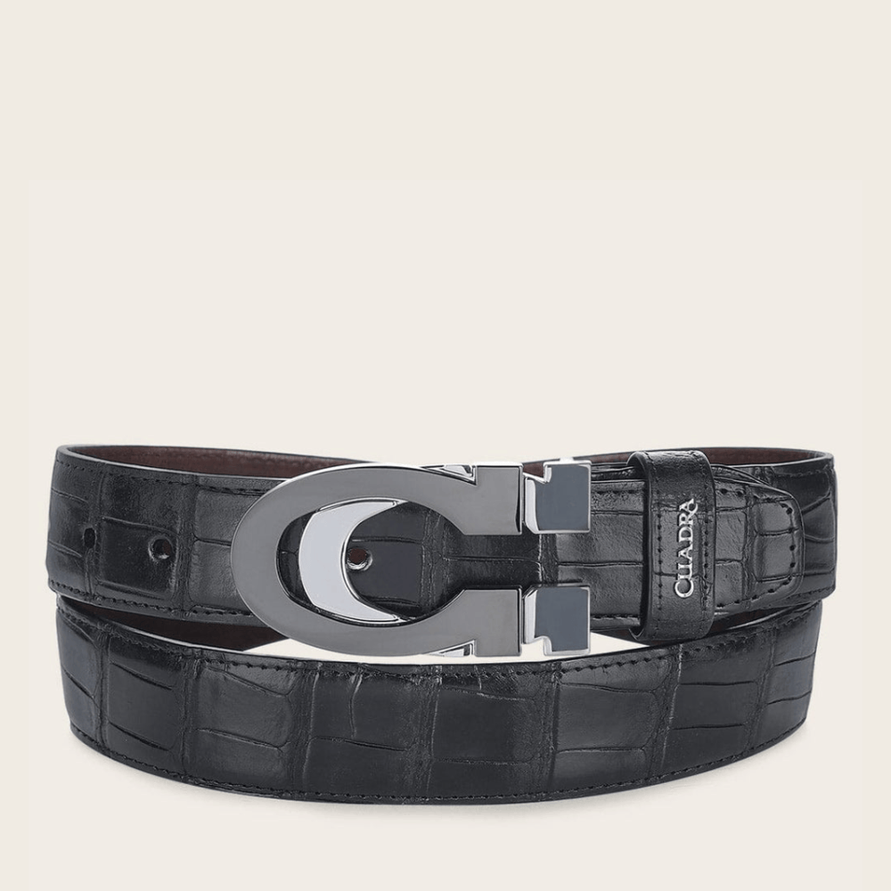 Este cinturón Cuadra en piel genuina de alligator color negro es una pieza de poder y distinción. Su textura marcada y natural resalta la exclusividad del material, mientras la hebilla metálica con diseño robusto y acabado pulido aporta un carácter sofisticado y dominante. Ideal para el hombre que entiende el lujo como presencia, detalle y autoridad silenciosa. Un accesorio que eleva cualquier atuendo con elegancia absoluta y esencia Cuadra.