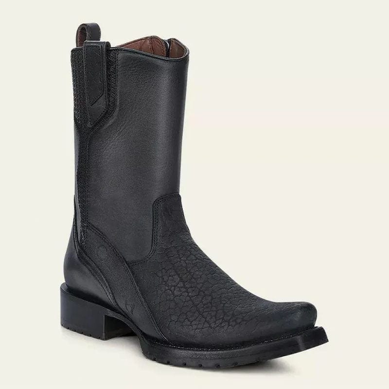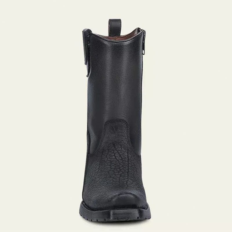 Bota para caballero en piel genuina de cuello de toro y piel de bovino. Al costado presenta grabado del logotipo Cuadra, así como aplicaciones de TPU que dan contraste de texturas. La oreja cuenta con aplicación de piel genuina de cuello de toro. Ajuste por medio de cierre interno. Suela de cuero con TPU. Color negro.