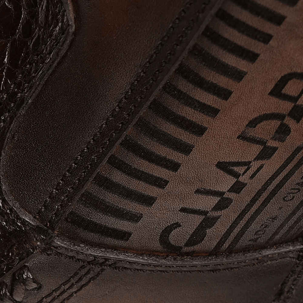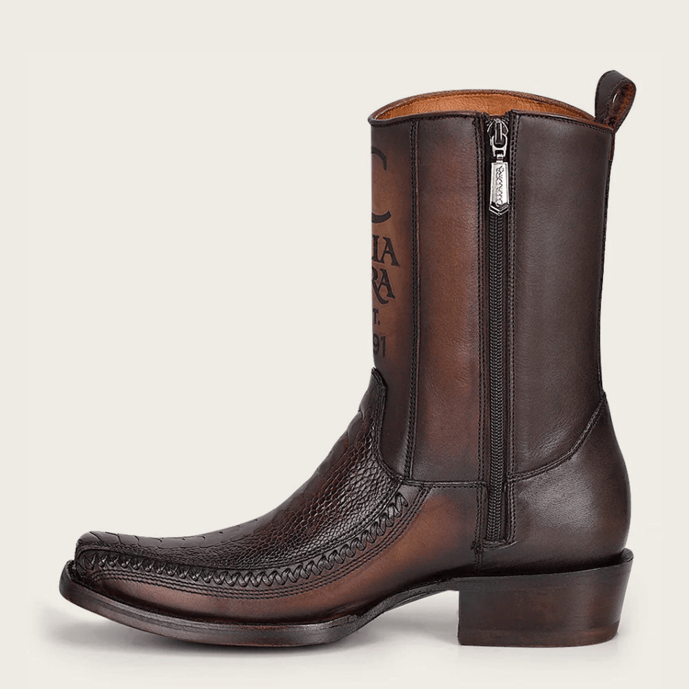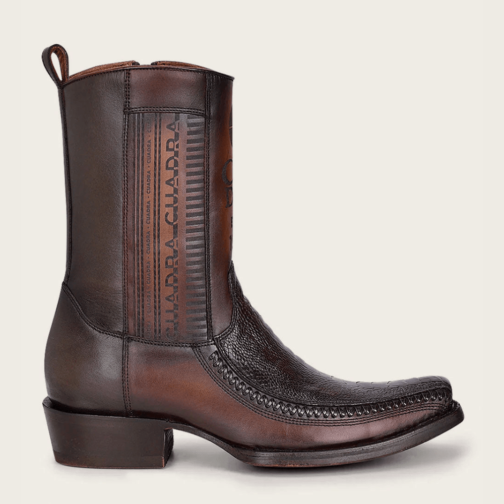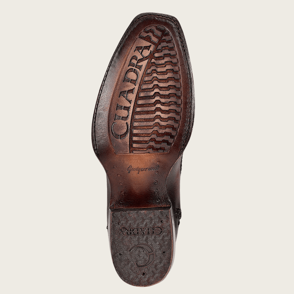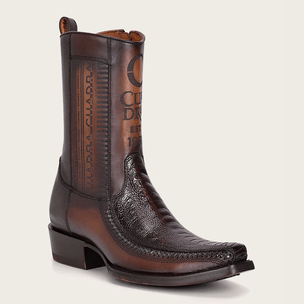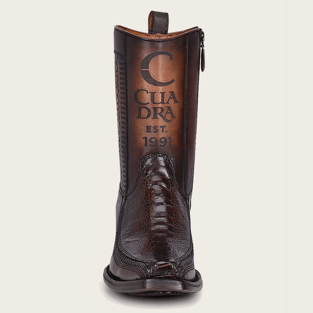 Imponente y sofisticada. Esta bota Cuadra para hombre en piel genuina de pata de avestruz café destaca por su textura natural única y su acabado profundo que proyecta poder y elegancia. La combinación de piel de bovino grabado en la caña con el carácter distintivo del avestruz en el empeine crea un contraste sutil pero dominante. Su estructura firme y tacón sólido la convierten en una pieza versátil, perfecta para un estilo western contemporáneo con presencia absoluta.
