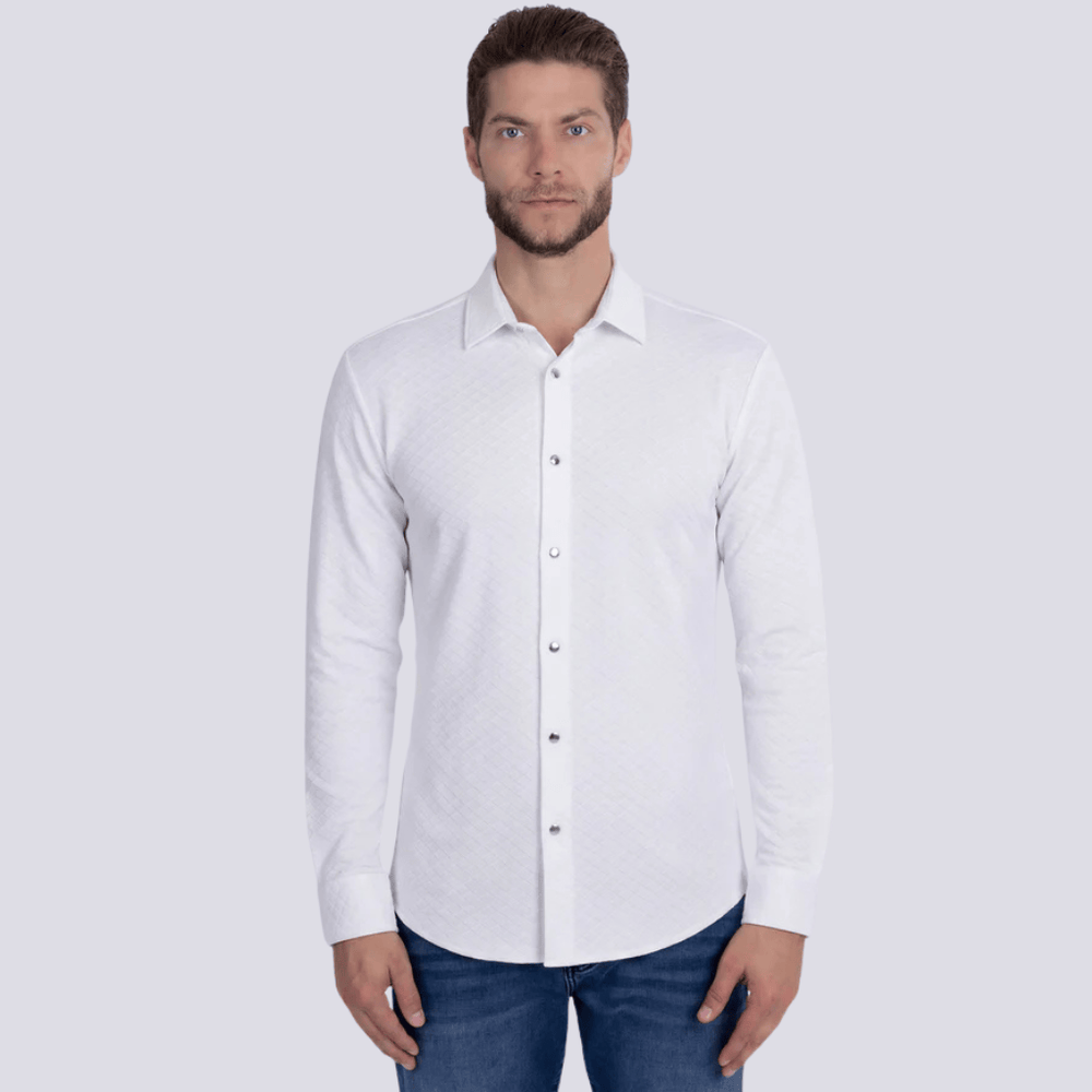 Eleva tu estilo con la Camisa Barabas Soft Diamond de manga larga, una pieza donde la confección experta se une con un diseño moderno y elegante. Su llamativo patrón geométrico tipo rombo se combina con una tela ligera y elástica de calidad premium, ofreciendo una comodidad superior sin perder sofisticación.