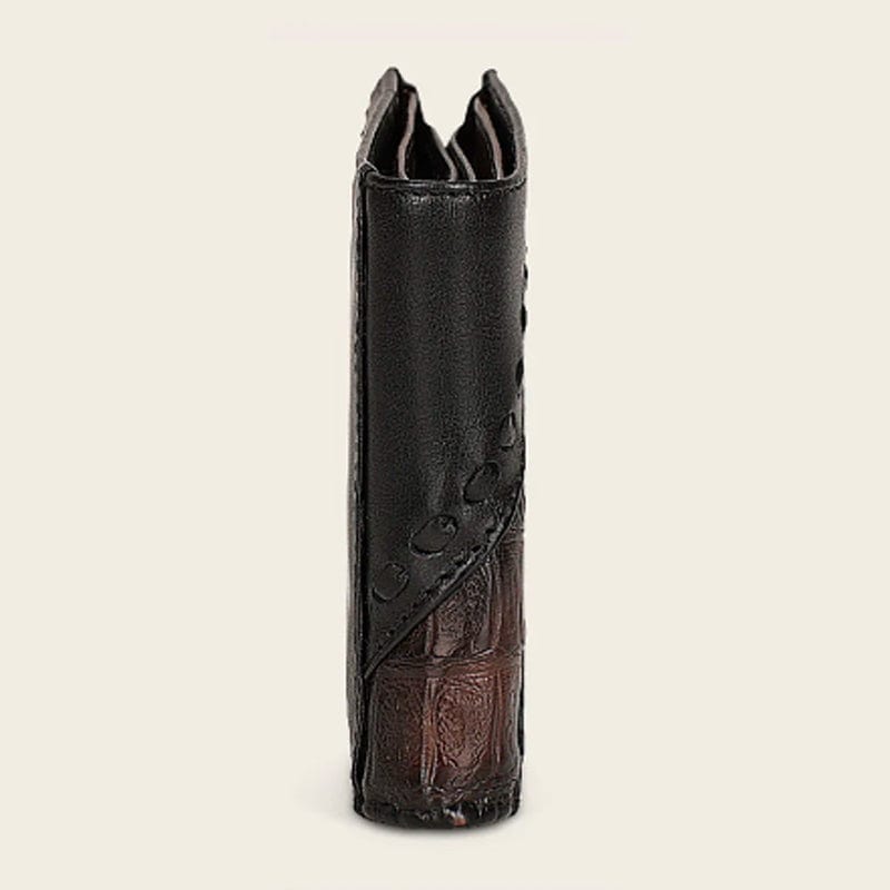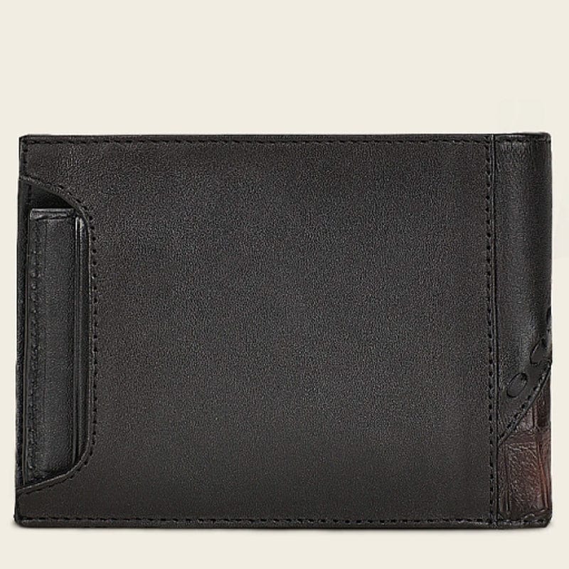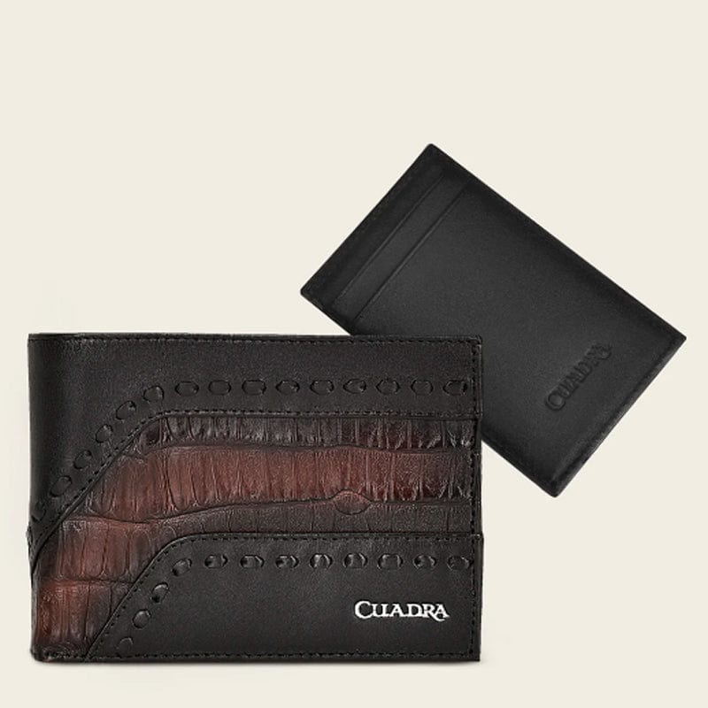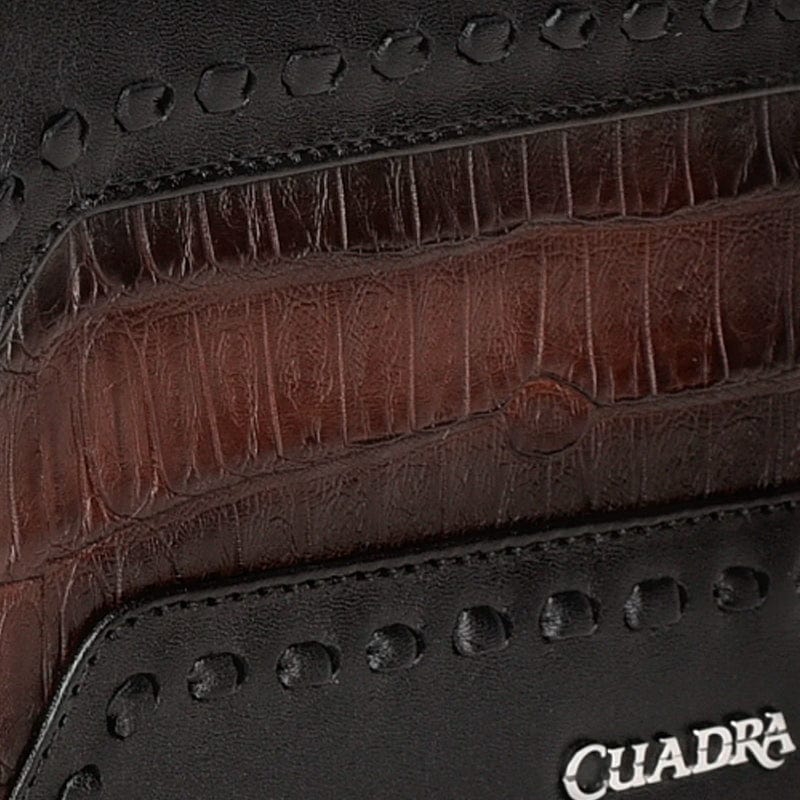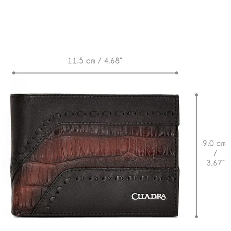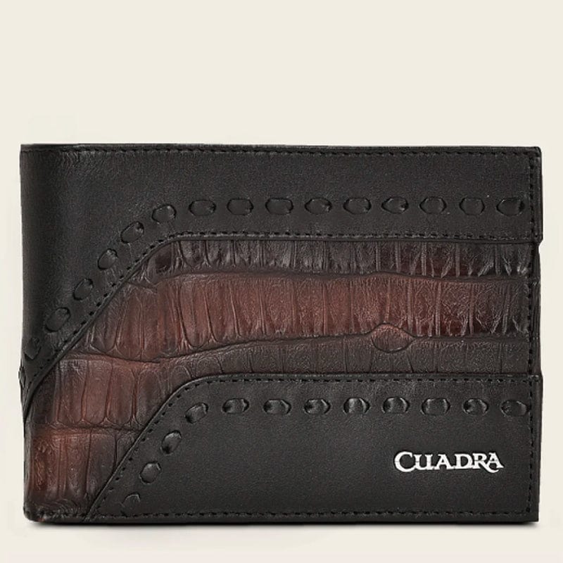 Cartera de libro para caballero en piel genuina de fuscus y piel de bovino. Al frente presenta tejido artesanal y aplicación metálica de logotipo Cuadra. En la parte trasera cuenta con un tarjetero desmontable con cinco espacios para tarjetas. En su interior cuenta con siete espacios para tarjetas y dos espacios para efectivo. Color negro.