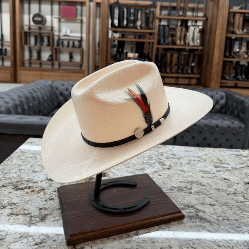 El tejido fino del material revela la calidad del trenzado, mientras que la banda sobria con herraje metálico y pluma decorativa multicolor añade un acento único y auténtico. Diseñado para quienes buscan porte, tradición y lujo en un sombrero de alto nivel.