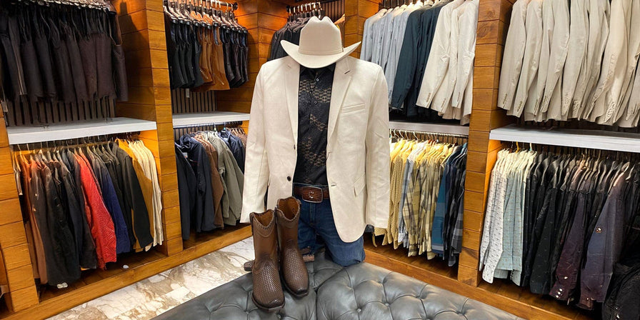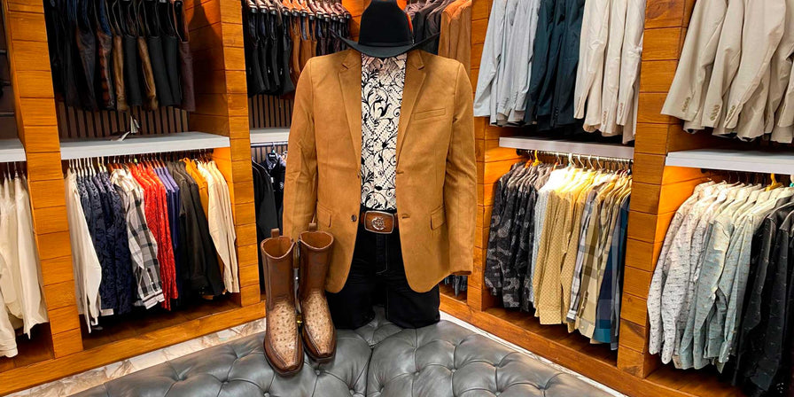 Un outfit vaquero para hombre con carácter y estilo. El saco en tono camel, camisa con diseño y botas claras crean un look llamativo, elegante y perfecto para destacar con personalidad.