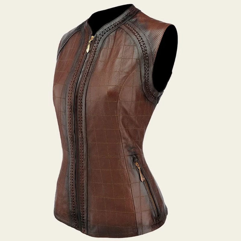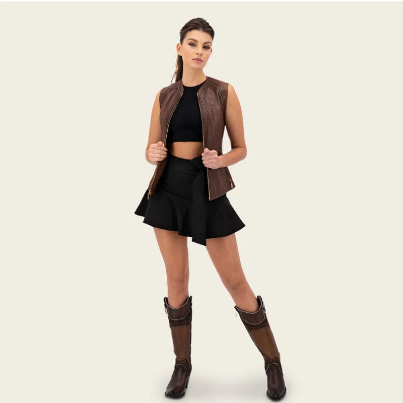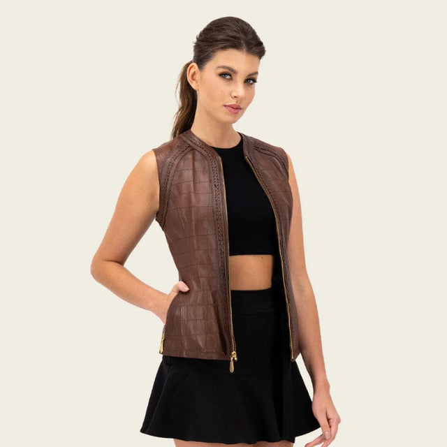 Chaleco para dama en piel genuina de ovino. Cuenta con dos bolsillos frontales ajustados con cierre. Con acabados que resaltan la silueta. Ajuste frontal por medio de cierre.